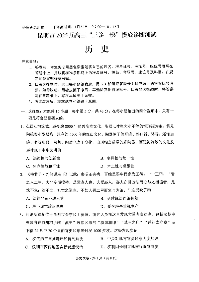 云南省昆明市2025届高三“三诊一模”1月摸底诊断测试历史