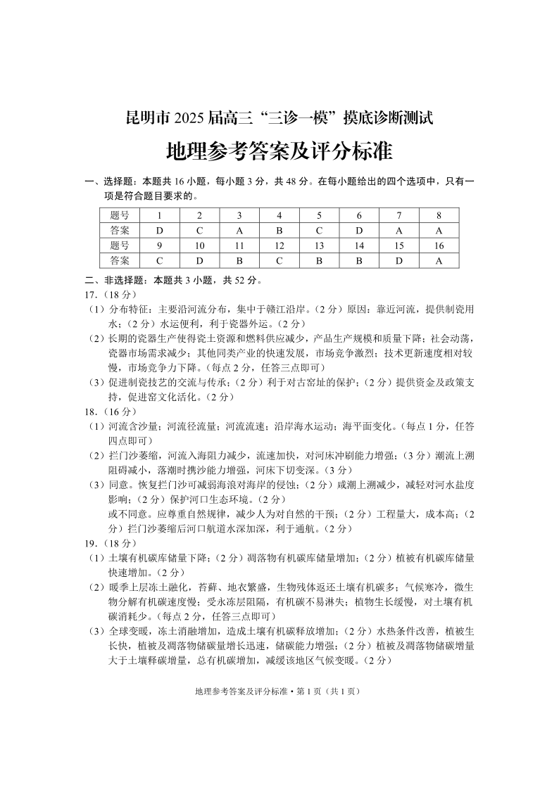 云南省昆明市2025届高三“三诊一模”1月摸底诊断测试地理答案