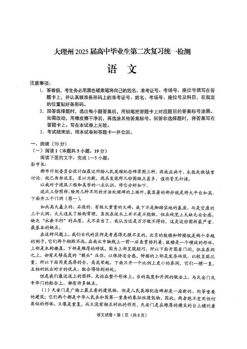云南省大理州2025届高三上学期第二次复习统一检测语文