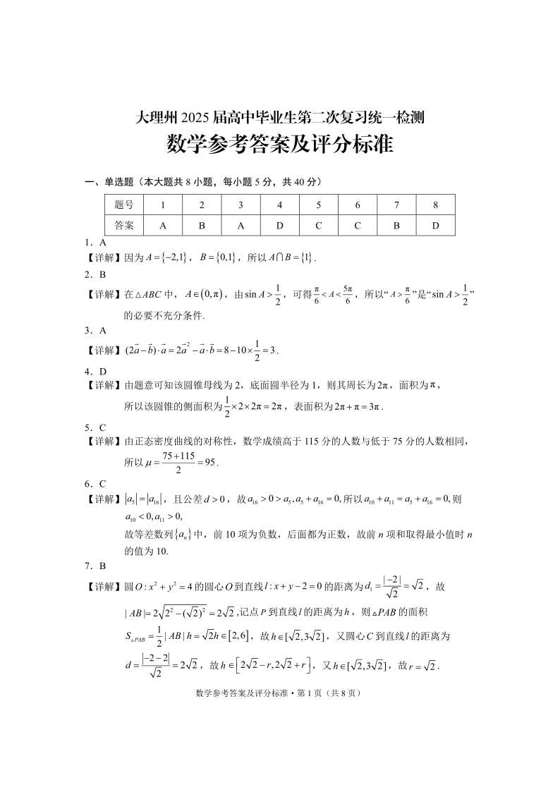 云南省大理州2025届高三上学期第二次复习统一检测数学答案