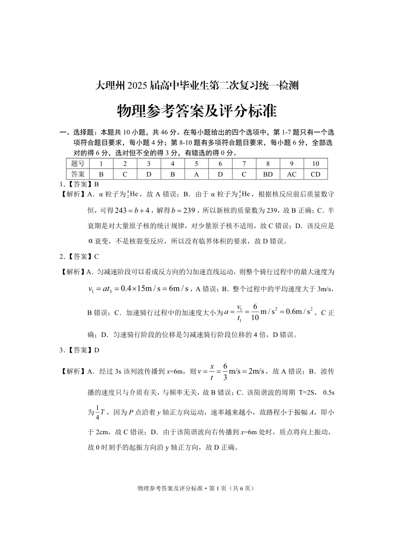 云南省大理州2025届高三上学期第二次复习统一检测物理答案