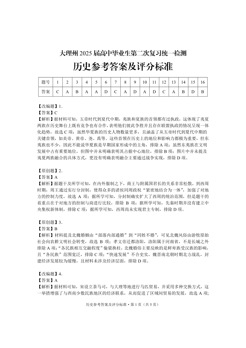 云南省大理州2025届高三上学期第二次复习统一检测历史答案