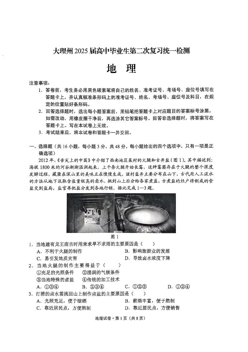 云南省大理州2025届高三上学期第二次复习统一检测地理