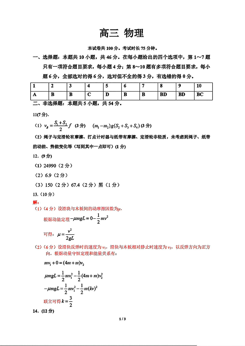 江西省九江市2025届高三上学期第一次高考模拟统一考试物理答案