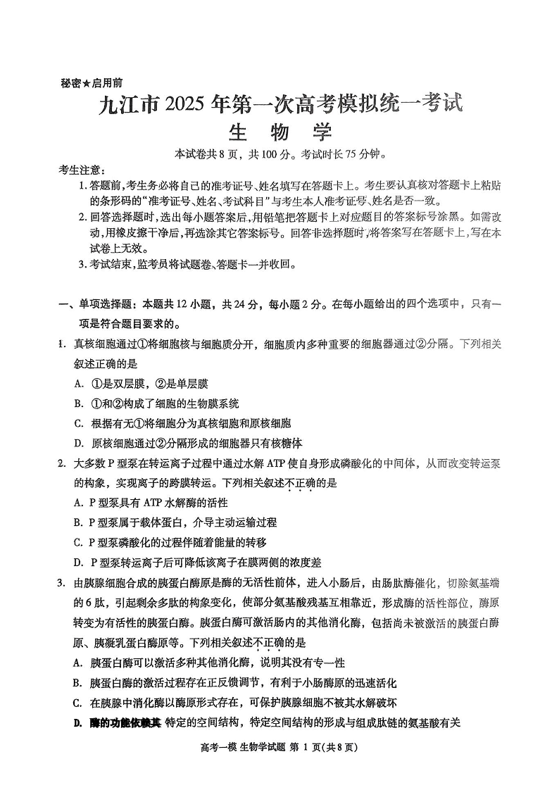 江西省九江市2025届高三上学期第一次高考模拟统一考试生物+答案