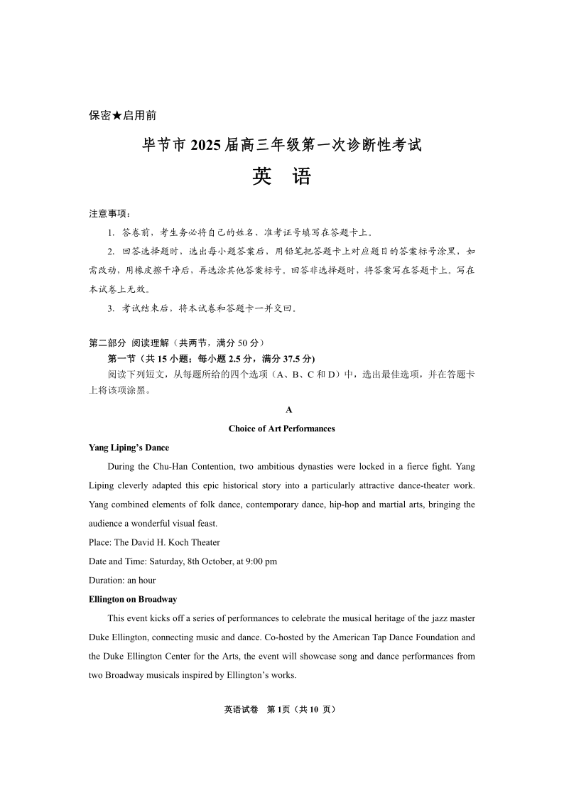 贵州省毕节市2025届高三上学期第一次诊断考试英语