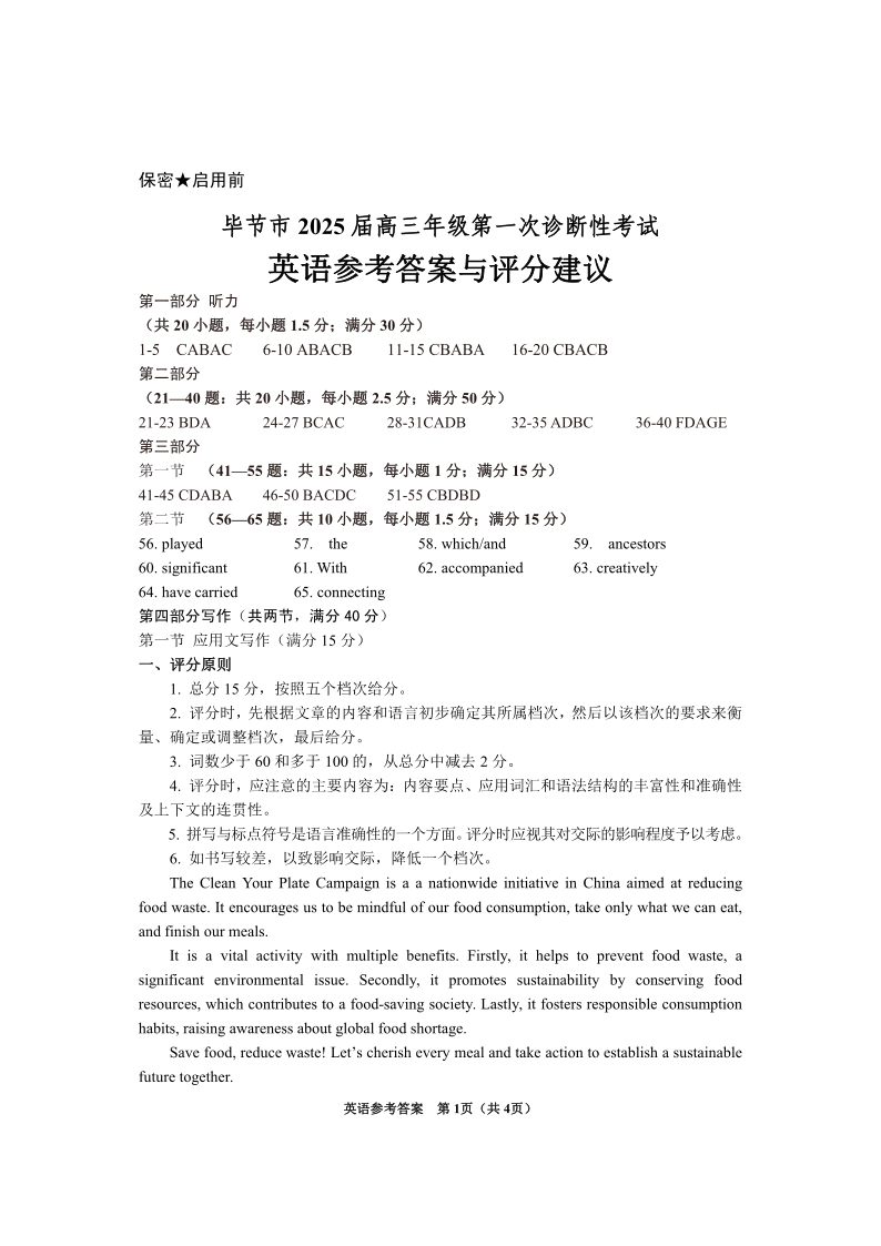 贵州省毕节市2025届高三上学期第一次诊断考试英语答案