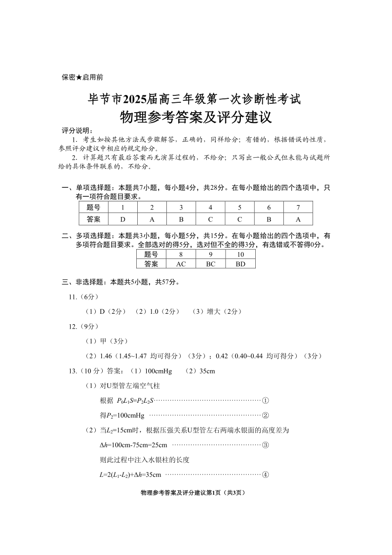 贵州省毕节市2025届高三上学期第一次诊断考试物理答案