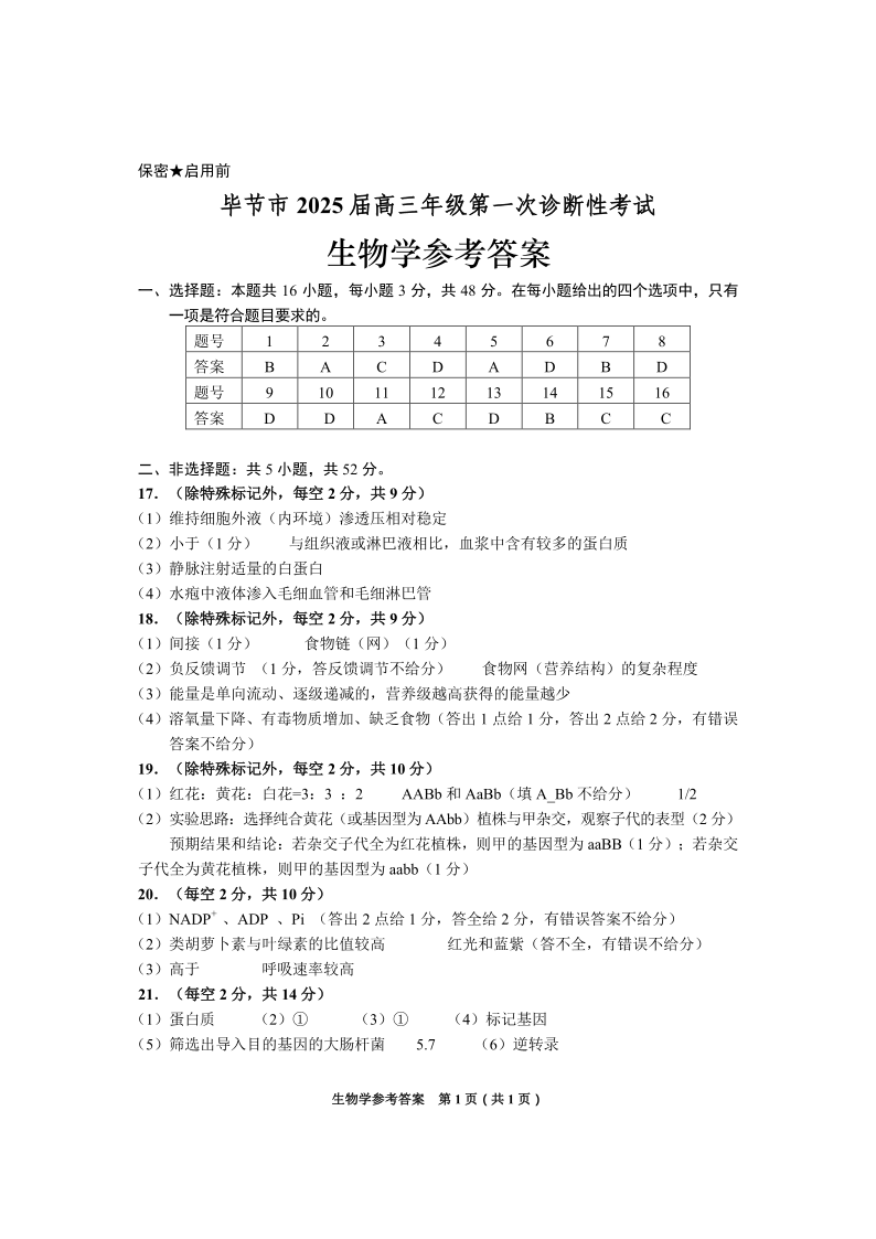 贵州省毕节市2025届高三上学期第一次诊断考试生物答案