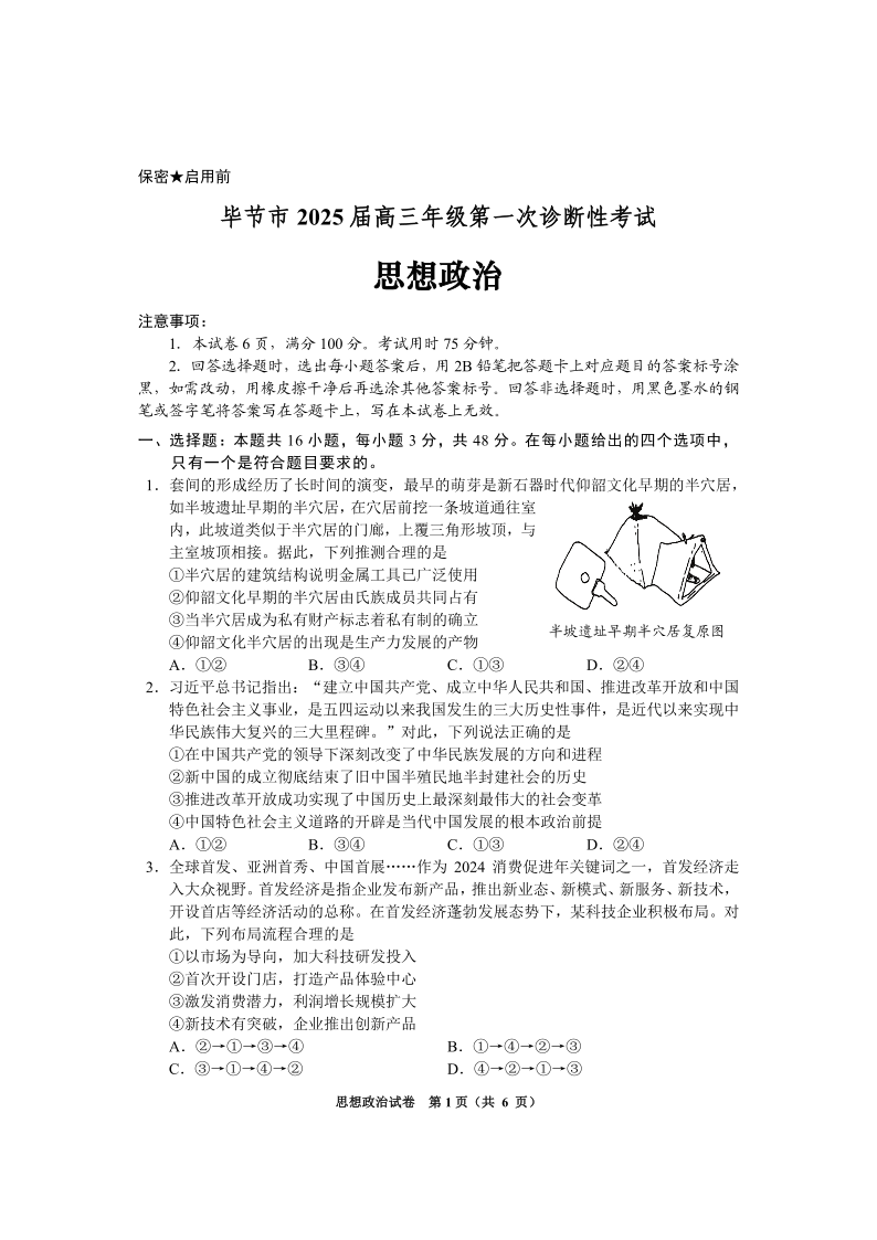 贵州省毕节市2025届高三上学期第一次诊断考试政治