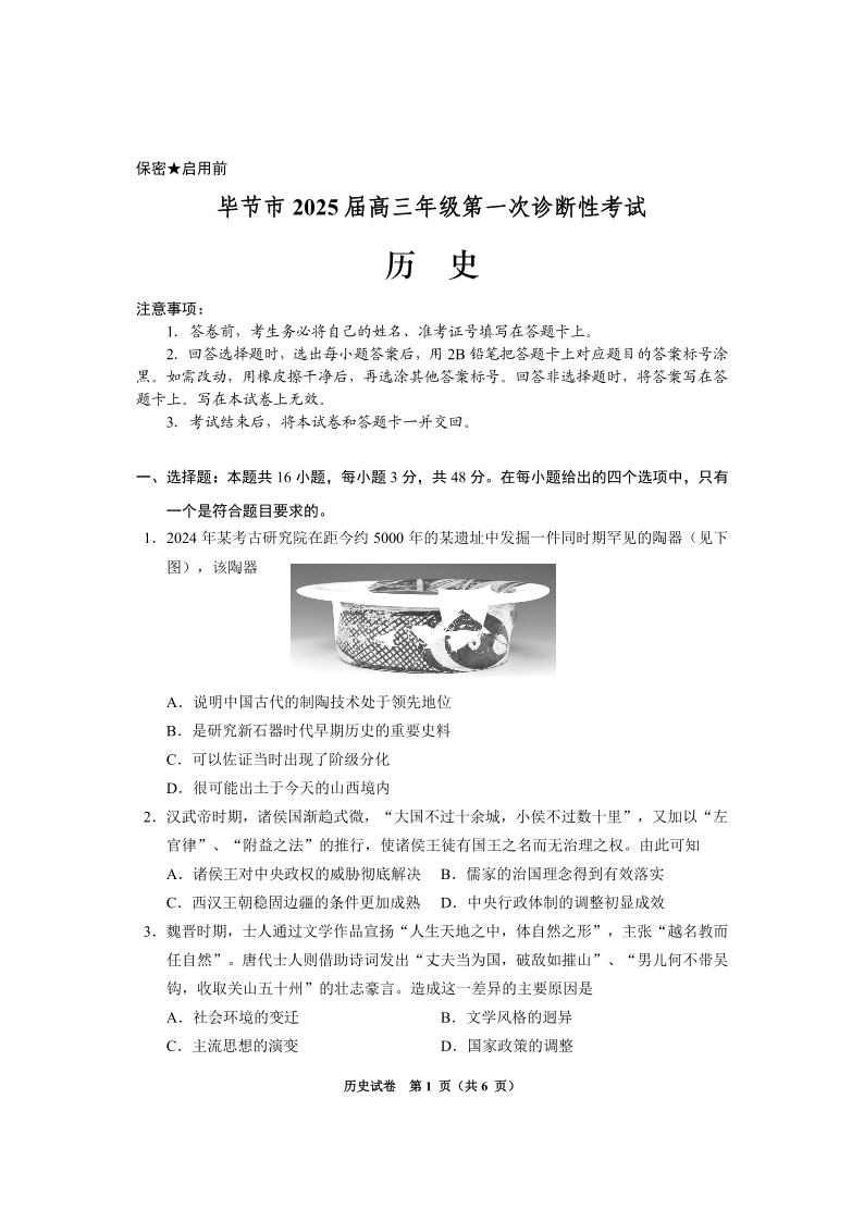 贵州省毕节市2025届高三上学期第一次诊断考试历史