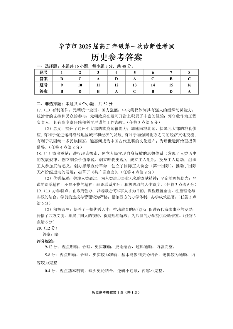 贵州省毕节市2025届高三上学期第一次诊断考试历史答案