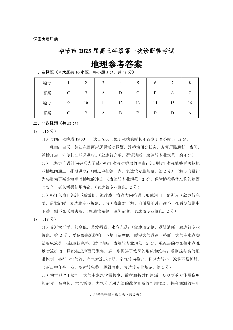 贵州省毕节市2025届高三上学期第一次诊断考试地理答案