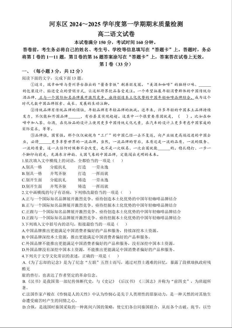 天津市河东区2024-2025学年上学期1月高二期末考试语文+答案