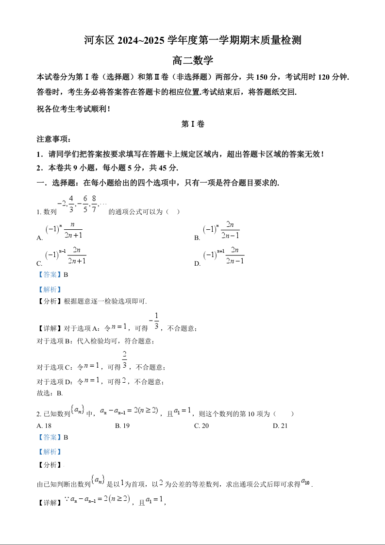 天津市河东区2024-2025学年上学期1月高二期末考试数学(解析版)