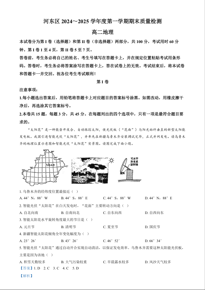 天津市河东区2024-2025学年上学期1月高二期末考试地理(解析版)