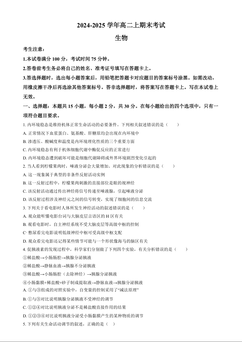 吉林省八校联考2024-2025学年上学期1月高二期末考试生物(原卷版)