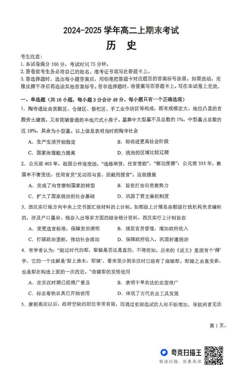 吉林省八校联考2024-2025学年上学期1月高二期末考试历史