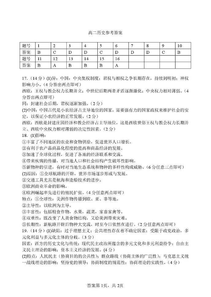 吉林省八校联考2024-2025学年上学期1月高二期末考试历史答案