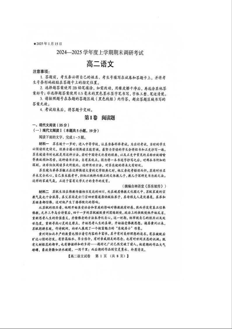 河南省三门峡市2024-2025学年上学期1月高二期末考试语文