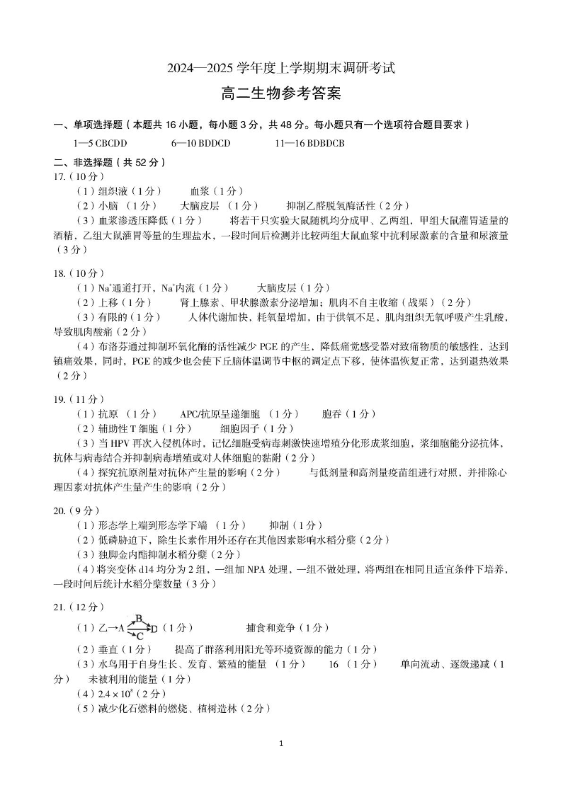河南省三门峡市2024-2025学年上学期1月高二期末考试生物答案