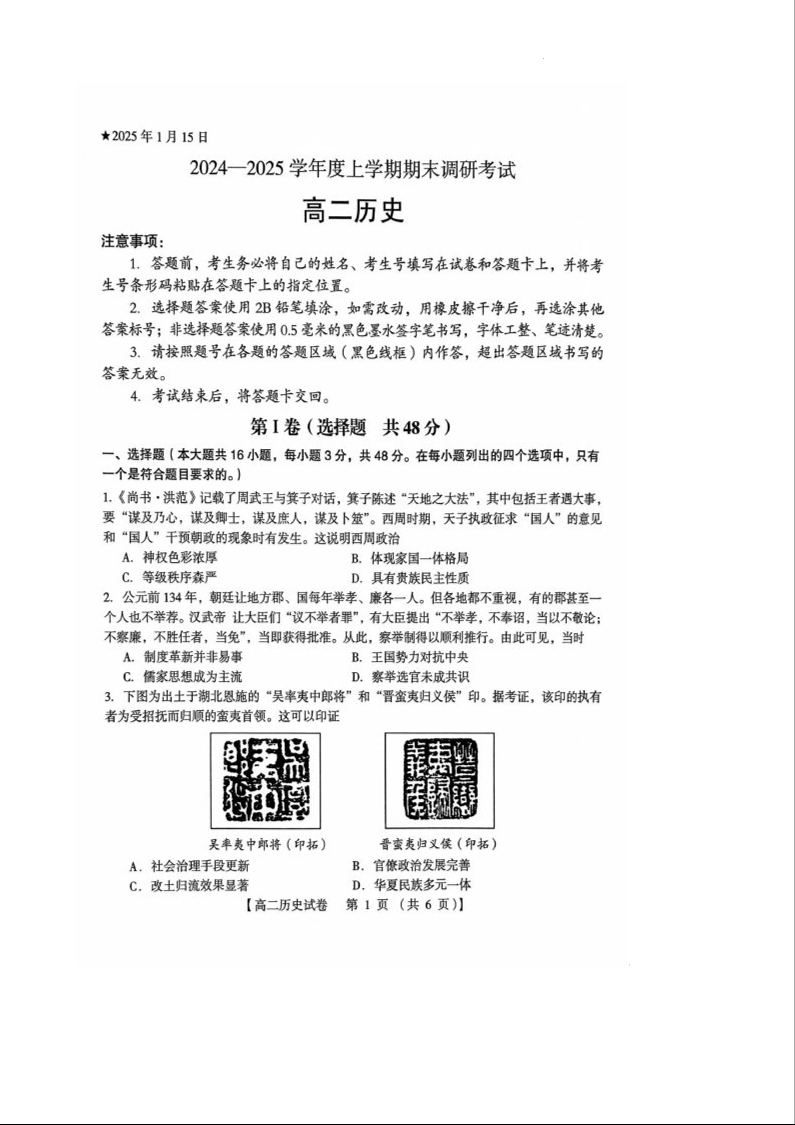 河南省三门峡市2024-2025学年上学期1月高二期末考试历史