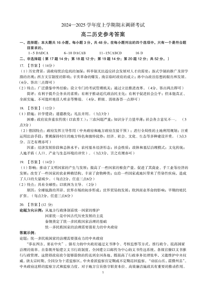 河南省三门峡市2024-2025学年上学期1月高二期末考试历史答案
