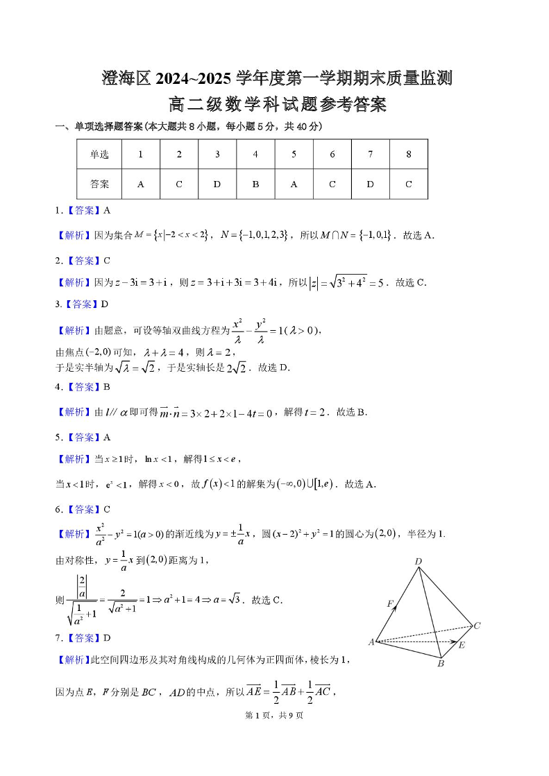 广东省汕头市澄海区2024-2025学年上学期1月高二期末考试数学答案