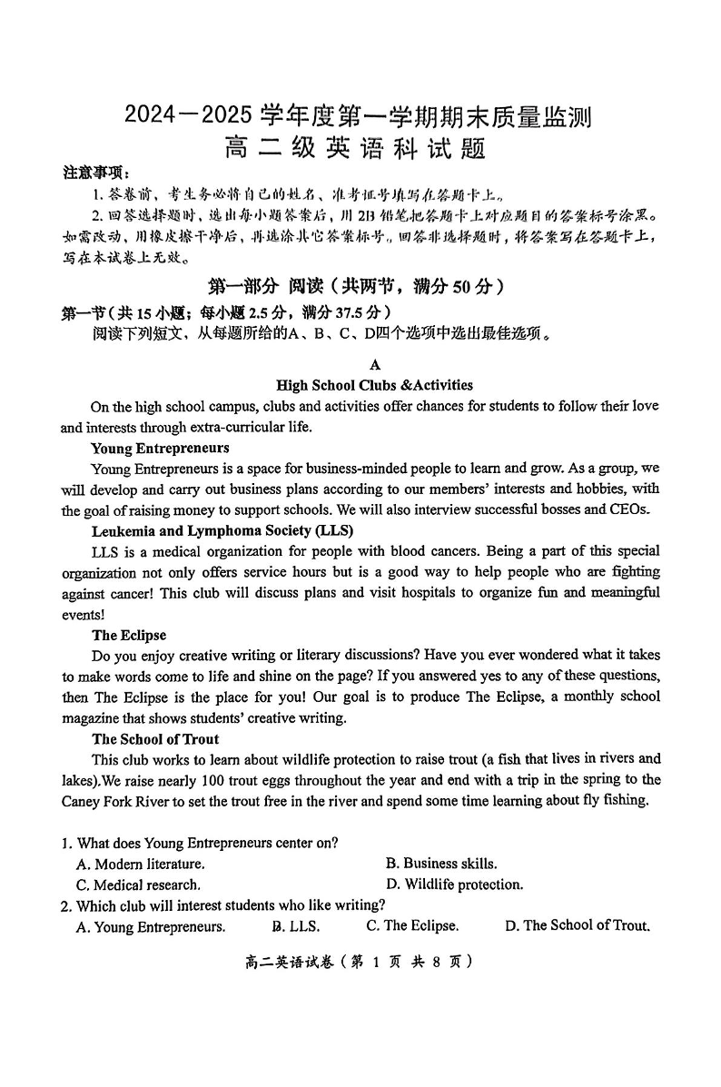 广东省汕头市澄海区2024-2025学年上学期1月高二期末考试英语