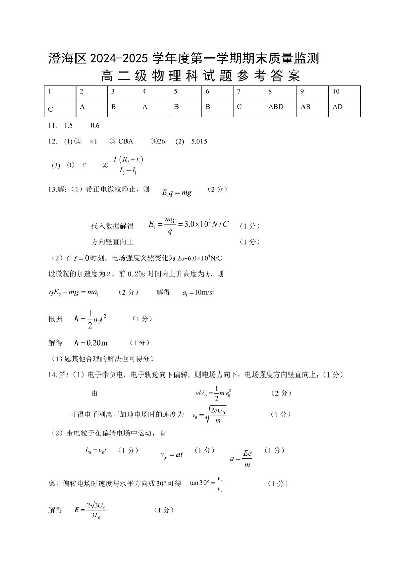 广东省汕头市澄海区2024-2025学年上学期1月高二期末考试物理答案