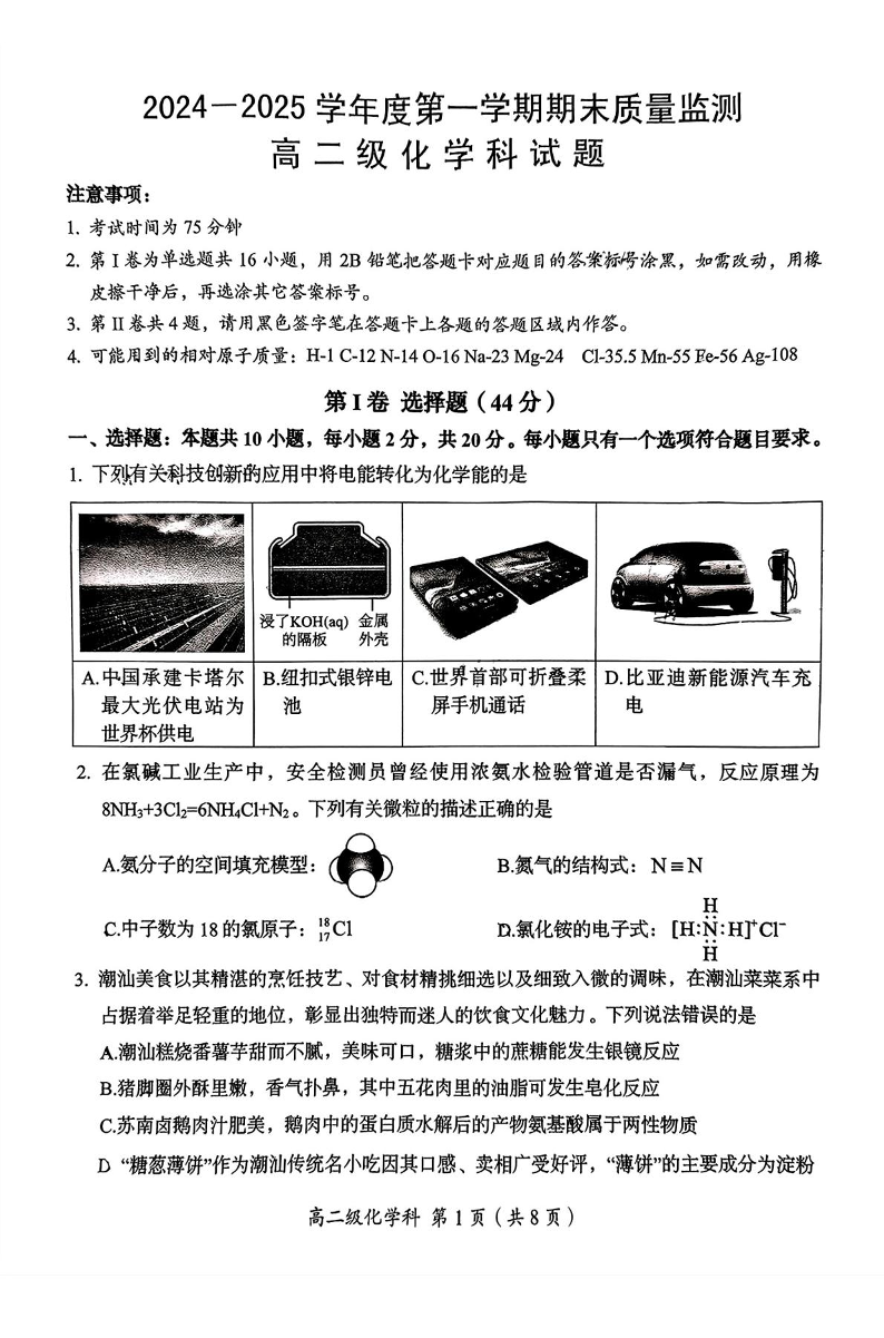 广东省汕头市澄海区2024-2025学年上学期1月高二期末考试化学