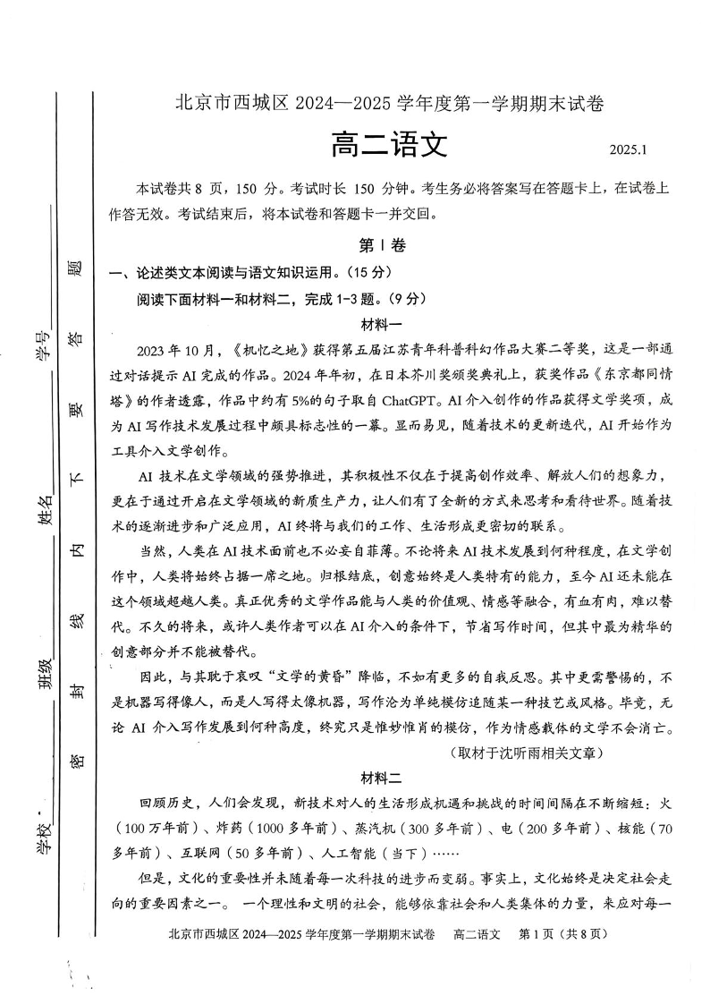 北京市西城区2024-2025学年上学期1月高二期末考试语文+答案