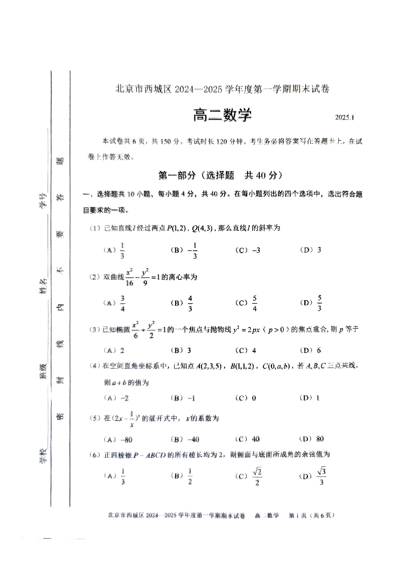 北京市西城区2024-2025学年上学期1月高二期末考试数学+答案
