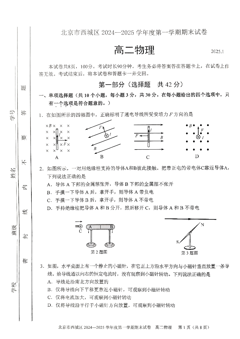 北京市西城区2024-2025学年上学期1月高二期末考试物理+答案