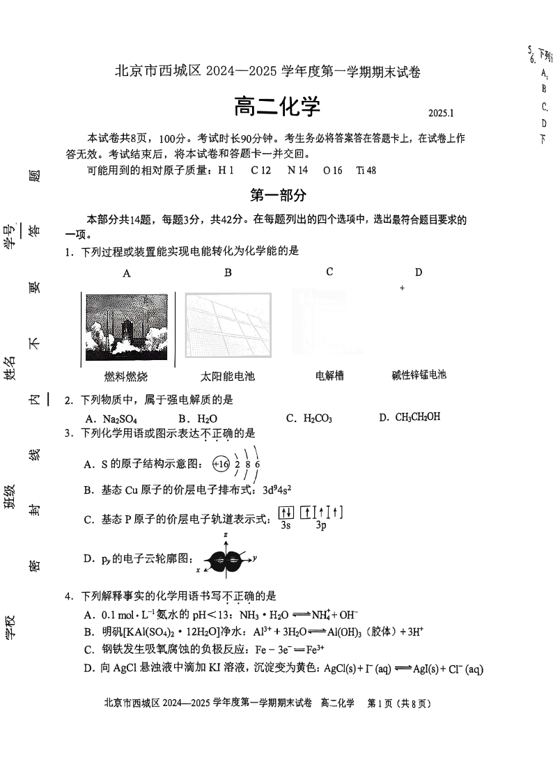 北京市西城区2024-2025学年上学期1月高二期末考试化学