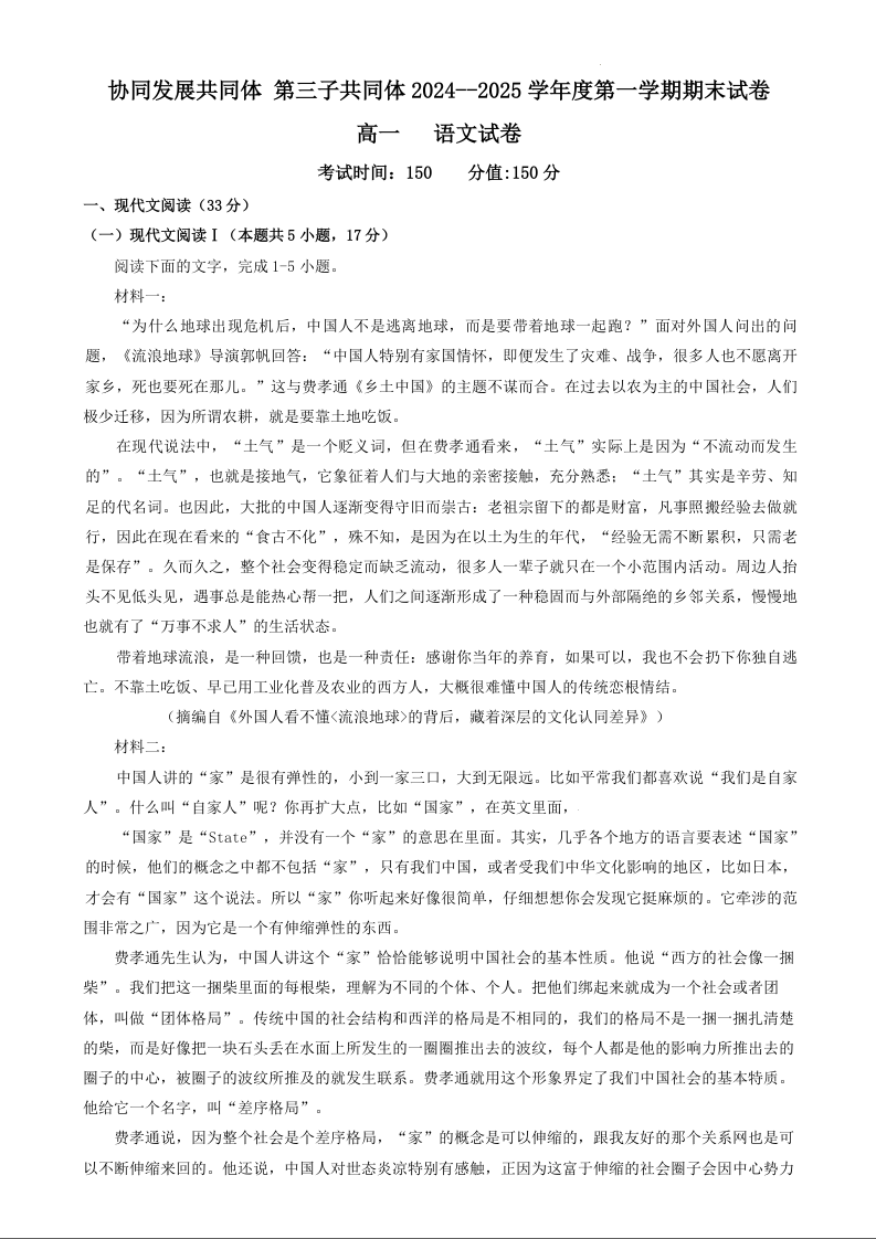 黑龙江省牡丹江市第三子共同体2024-2025学年高一上学期期末语文