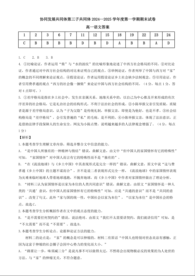 黑龙江省牡丹江市区域高中2024-2025学年上学期高一期末考试语文答案