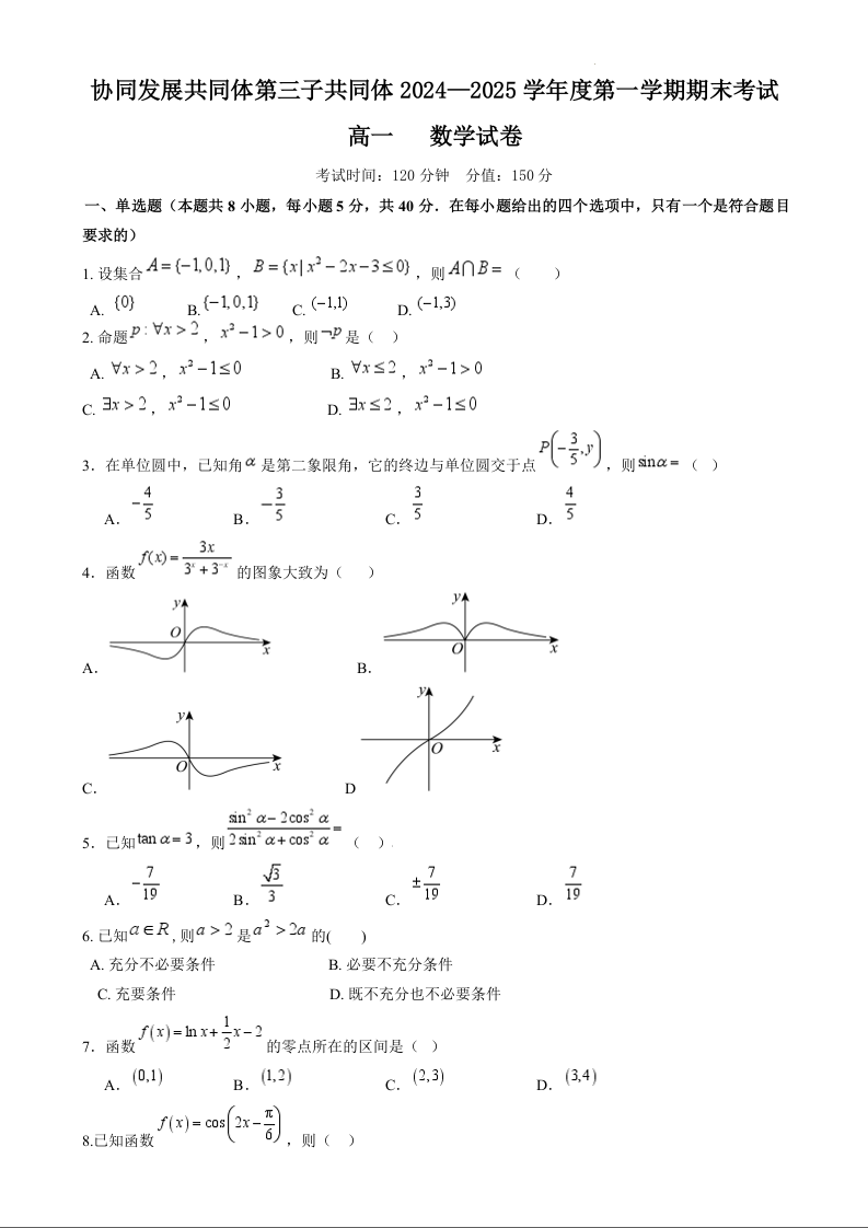 黑龙江省牡丹江市区域高中2024-2025学年上学期高一期末考试数学