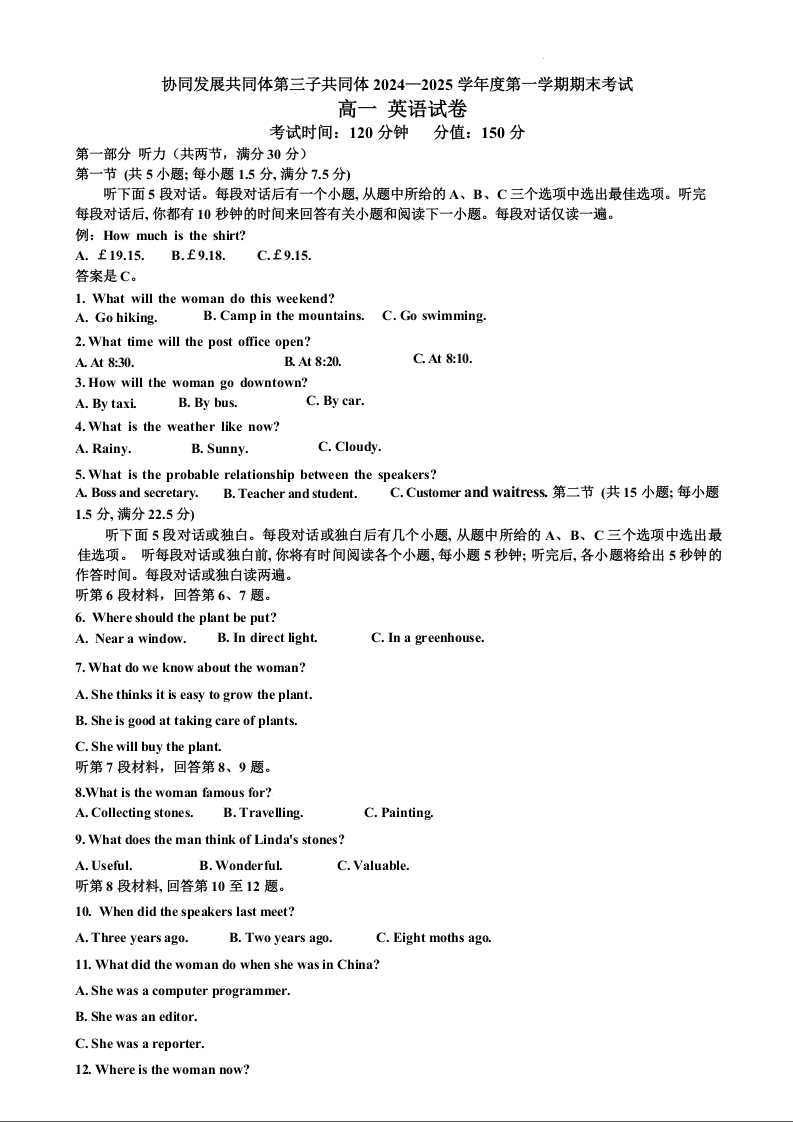 黑龙江省牡丹江市区域高中2024-2025学年上学期高一期末考试英语