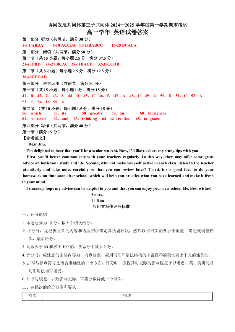 黑龙江省牡丹江市区域高中2024-2025学年上学期高一期末考试英语答案