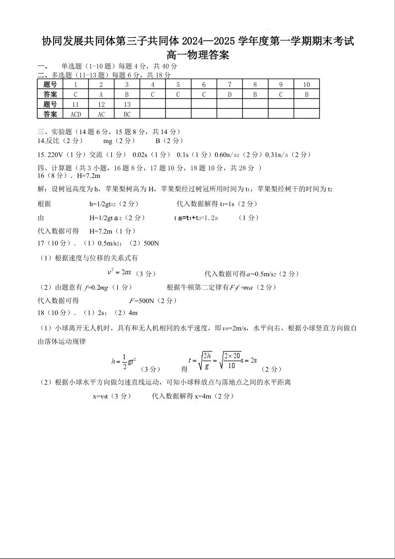 黑龙江省牡丹江市区域高中2024-2025学年上学期高一期末考试物理答案