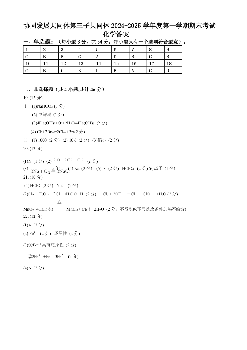 黑龙江省牡丹江市区域高中2024-2025学年上学期高一期末考试化学答案