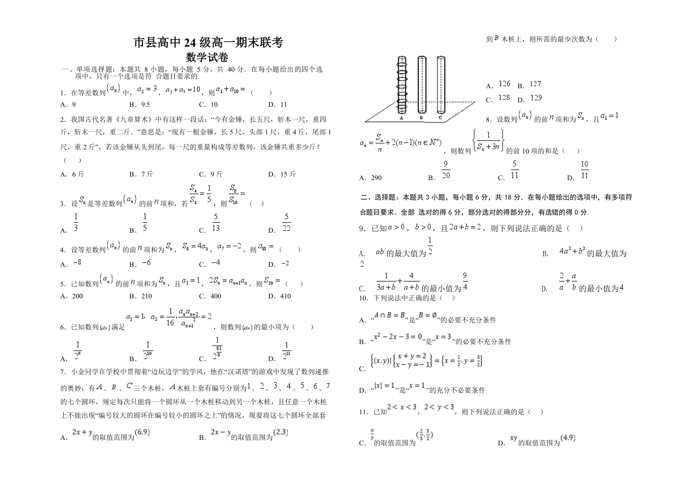 四川省眉山市2024-2025学年上学期1月高一期末联考数学