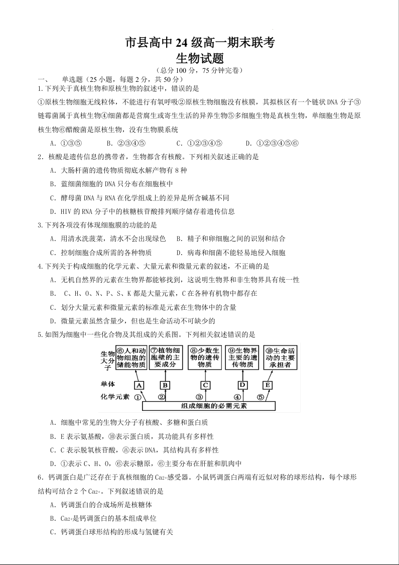 四川省眉山市2024-2025学年上学期1月高一期末联考生物