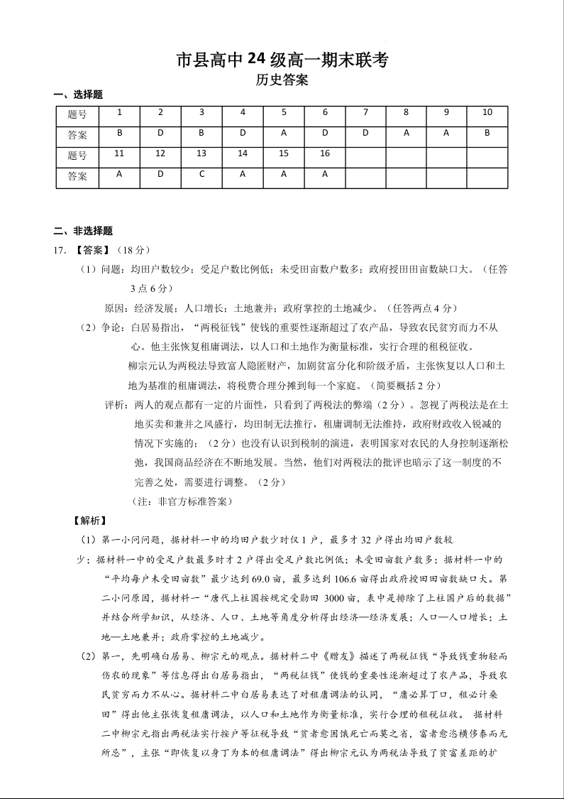 四川省眉山市2024-2025学年上学期1月高一期末联考历史答案