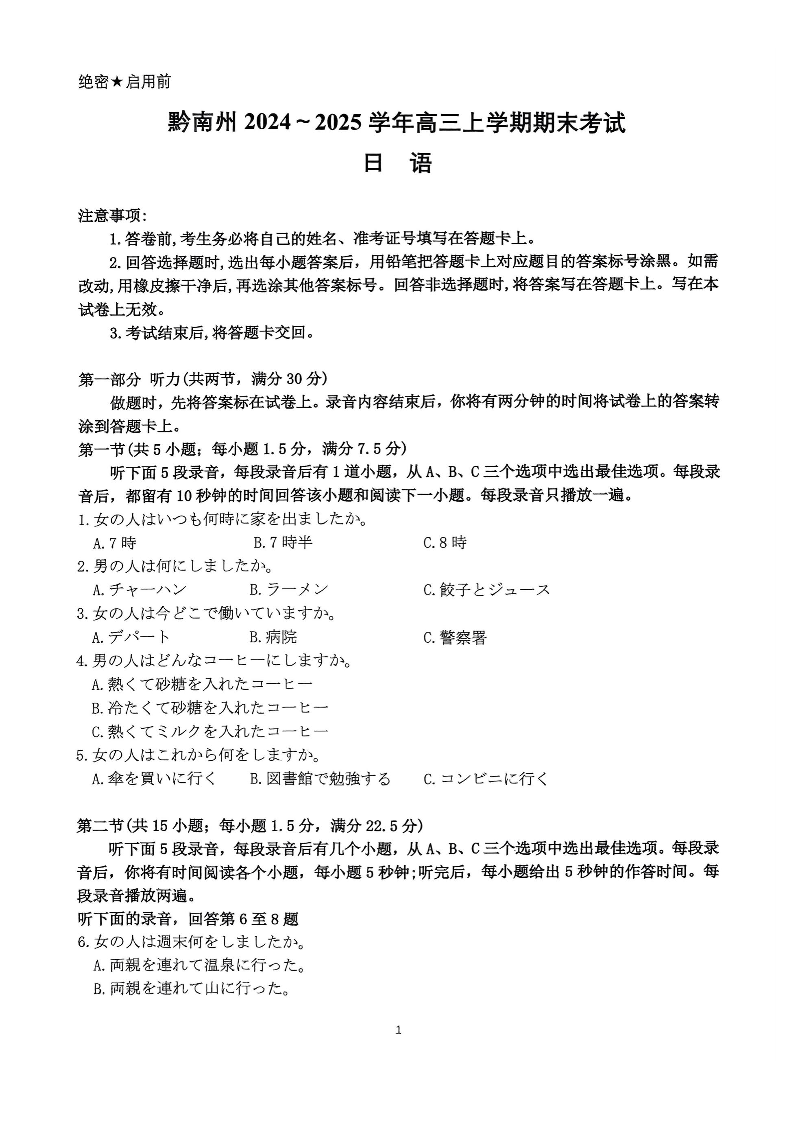 贵州省黔南州2024-2025学年上学期1月高三期末考试日语