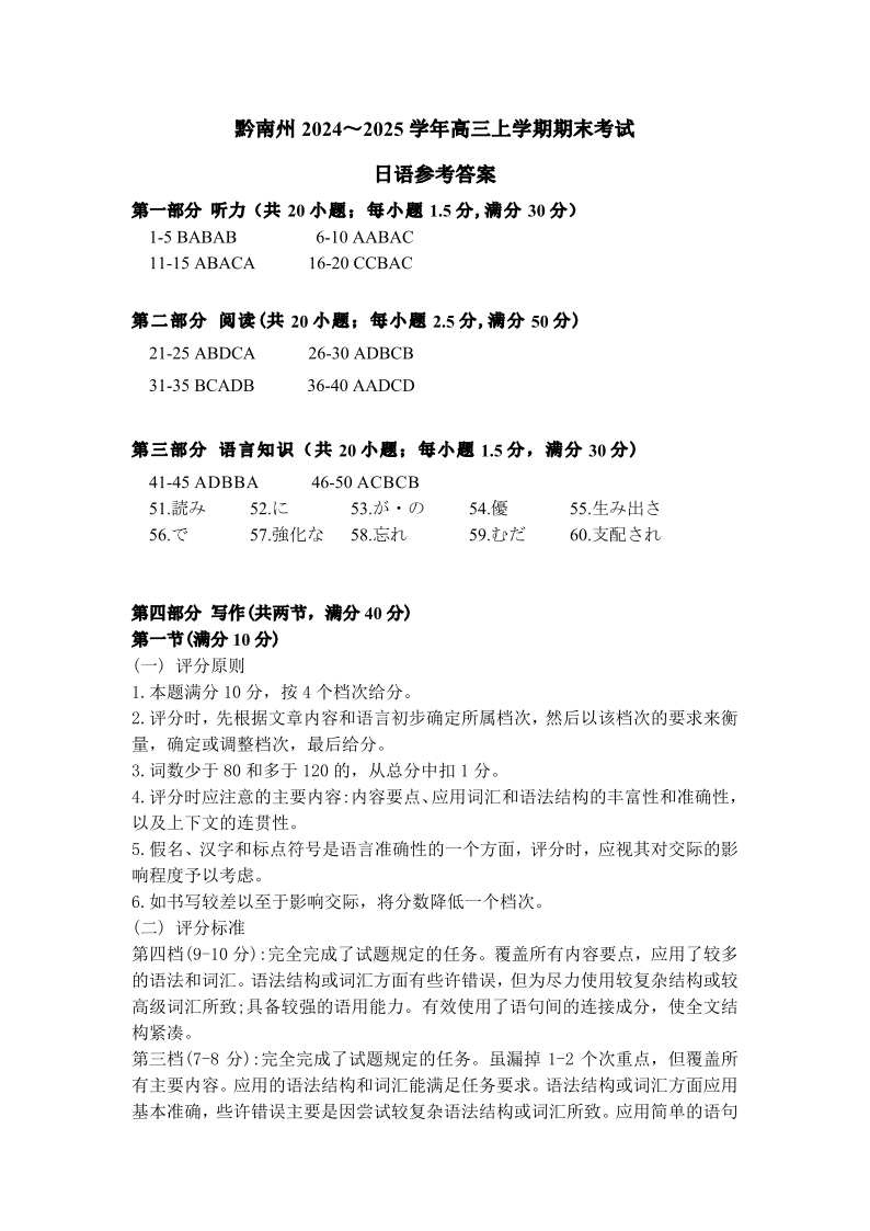 贵州省黔南州2024-2025学年上学期1月高三期末考试日语答案