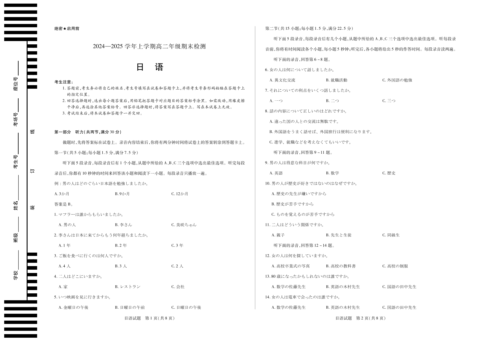 安徽区域高中2024-2025学年高二上学期期末检测日语