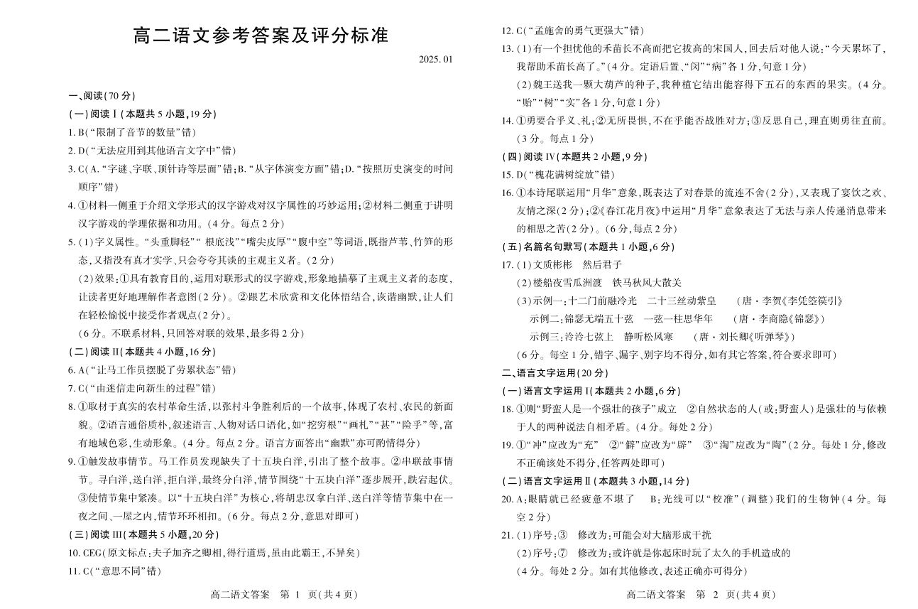 山东省潍坊市2024-2025学年上学期1月高二期末统一考试语文答案