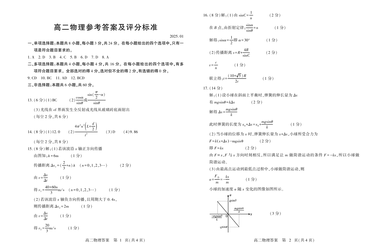 山东省潍坊市2024-2025学年上学期1月高二期末统一考试物理答案